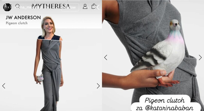 No, tu zabava ne staje. U idućem storyju Mirna je otišla korak dalje pa je “isprobala” torbicu na Katarini - doslovno. Postavila je njezinu glavu na modela sa stranice i pokazala kako bi joj ta torbica odlično stajala. Jedino je pitanje – gdje uopće nositi goluba od 790 eura?